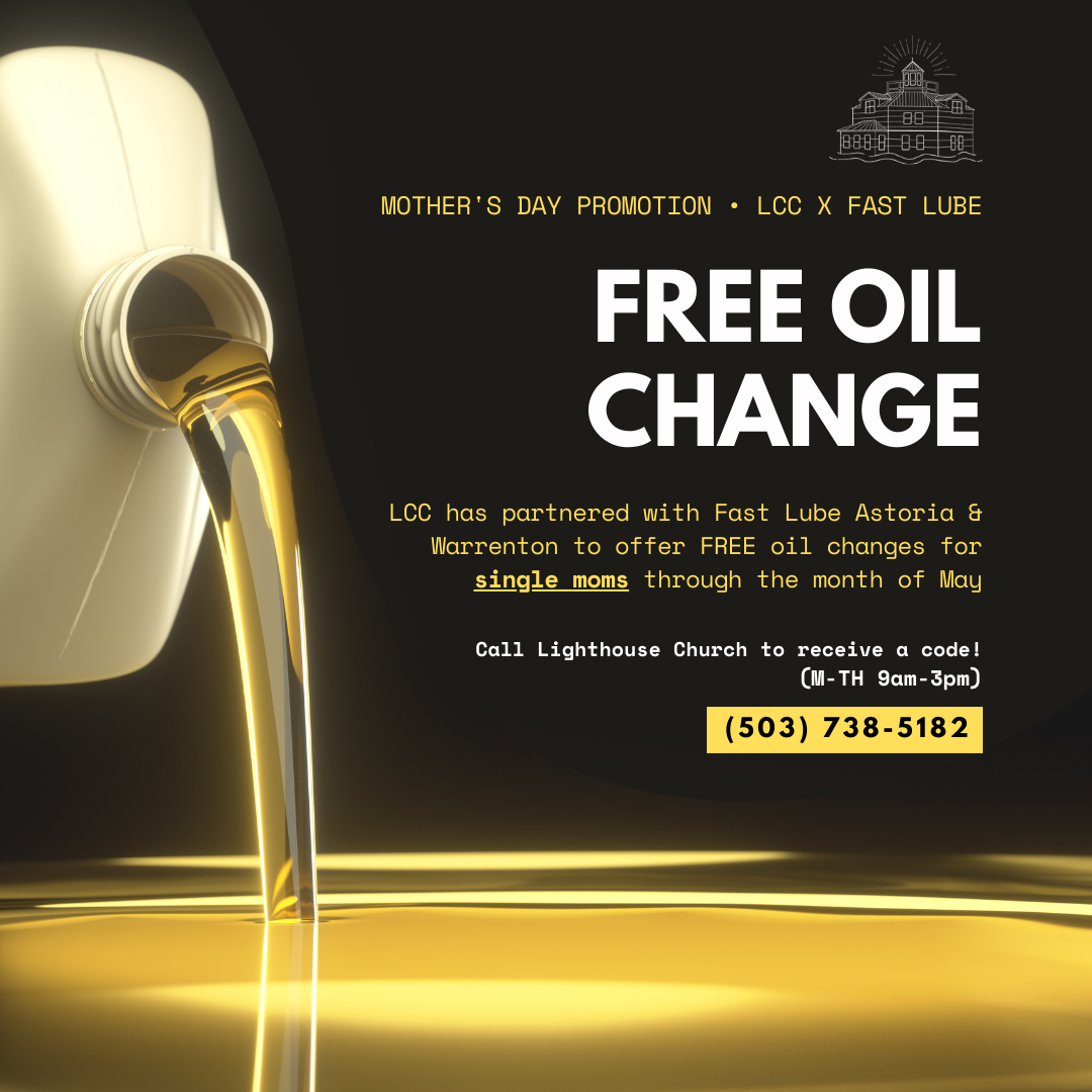 LCC has partnered with Fast Lube Astoria & Warrenton to offer FREE oil changes for 100 single moms (must be: 18-80 years old, on own, w/ children). To receive the promotion, you must call our church office to receive the Fast Lube code: (503) 738-5182 Mon-Thur 9am to 3pm. This offer is valid through the month of May!